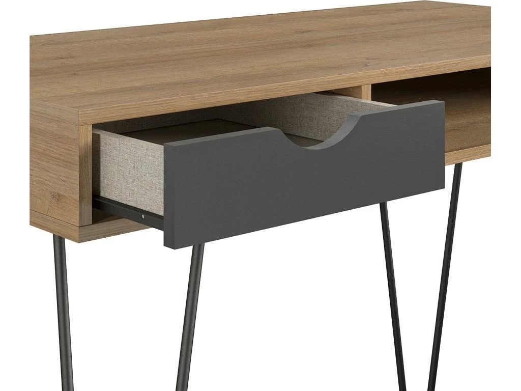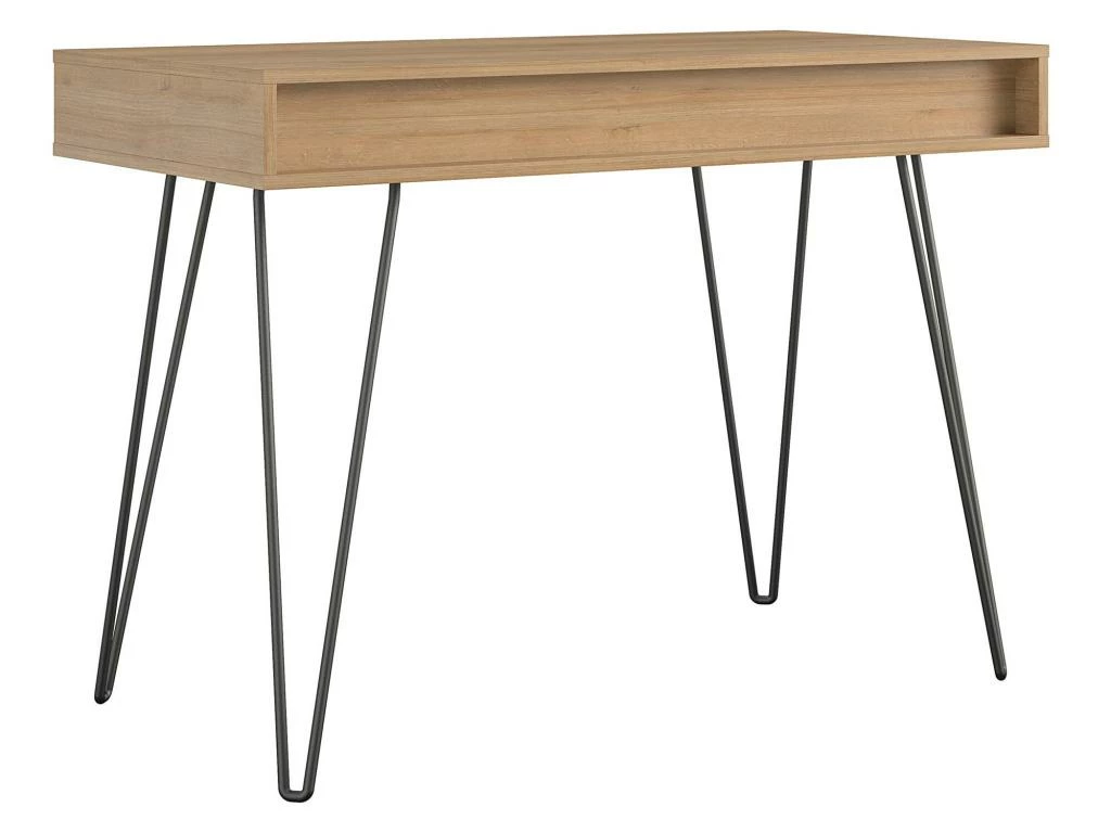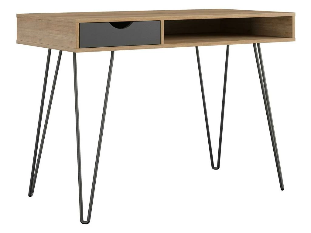 Fabriqué en panneau de particules laminé, la finition classique se marie avec les pieds en métal en forme d’épingle pour un aspect rétro.