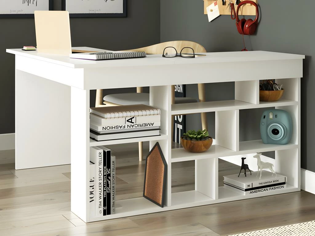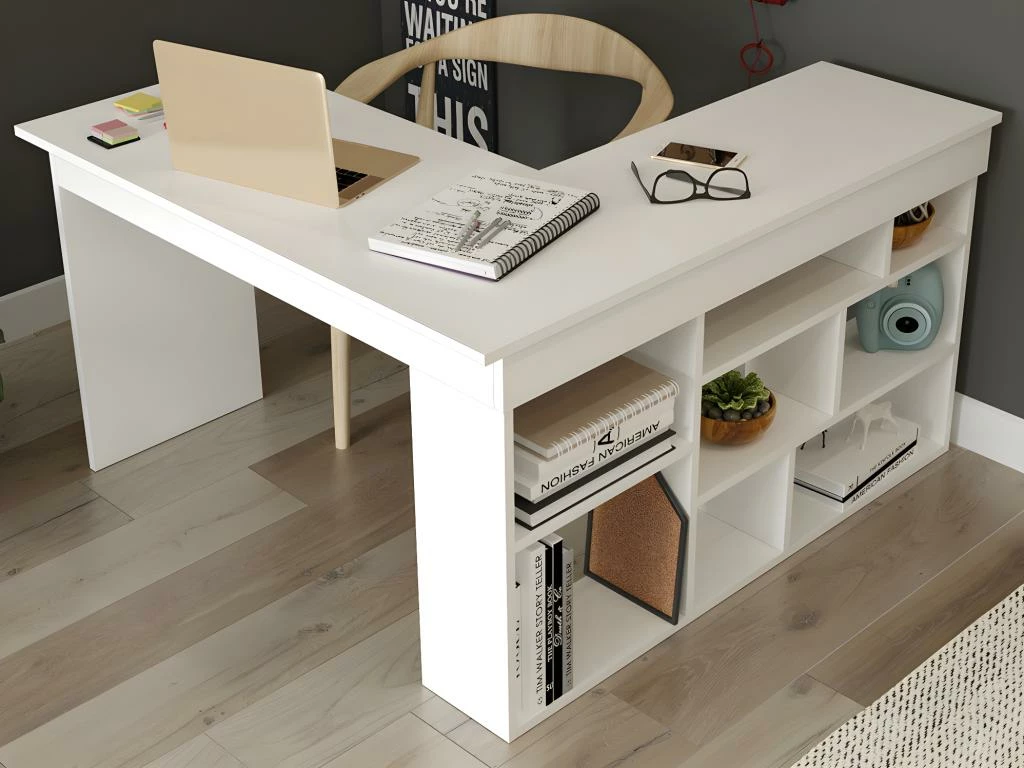 Grâce à des étagères incorporées dans l’un de ses pieds, le bureau d’angle LILEUL est le meuble parfait pour créer du rangement dans votre espace de travail. Réel bureau d’angle, LILEUL vous offre 2 grands et profonds plateaux, parfait pour des journées de télétravail productives !