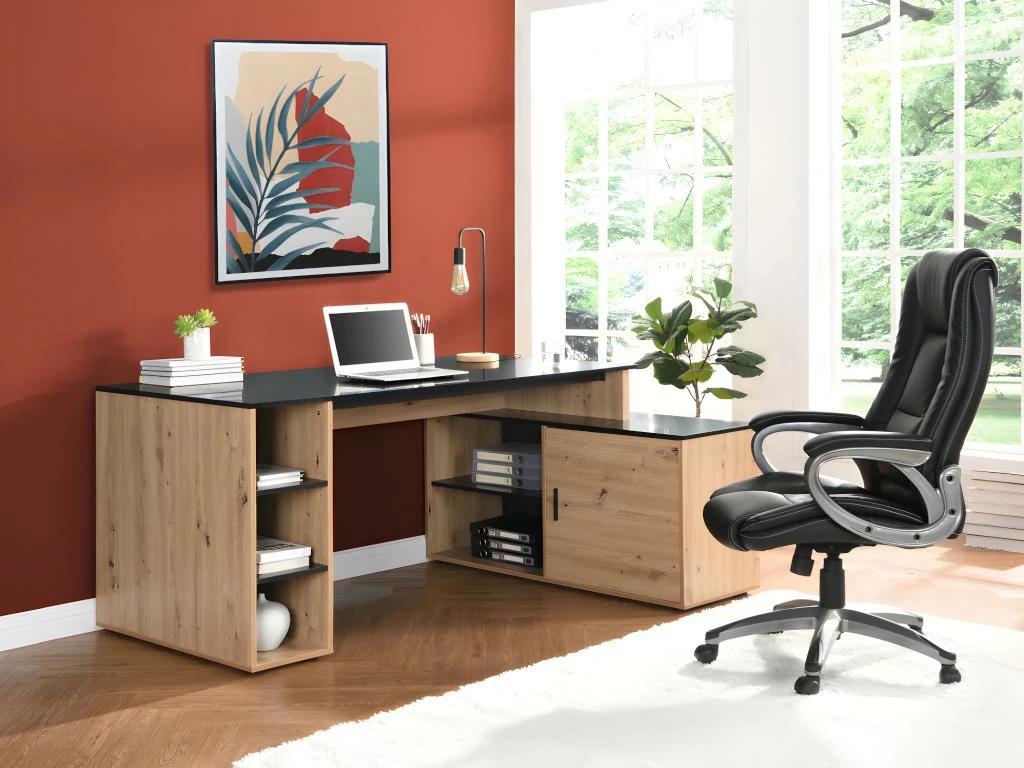 Le bureau d’angle ROMIARA saura vous convaincre grâce à ses 5 niches et son placard intégré, parfait pour un espace de travail ordonné ! De couleur naturel et noir, ce bureau apportera de la modernité à votre pièce.