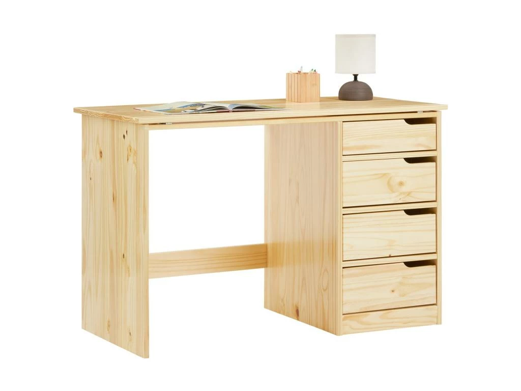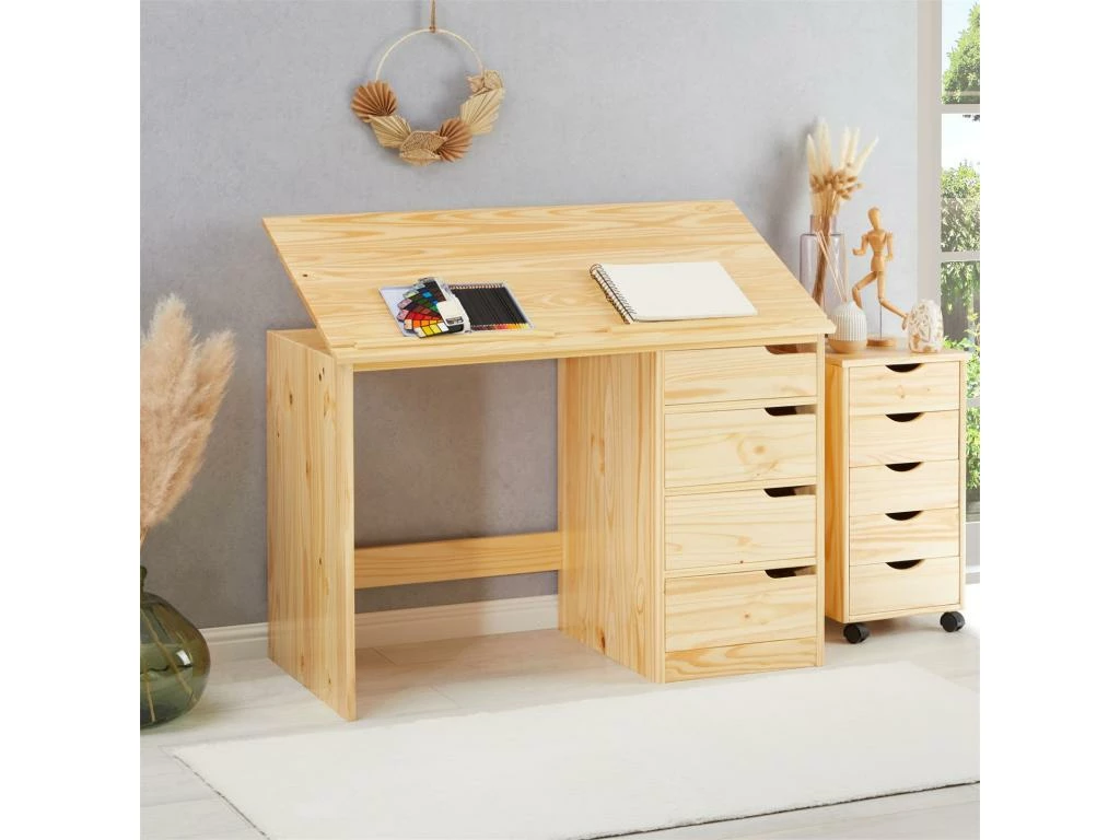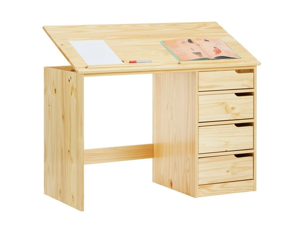 Bureau Enfant écolier Junior EMMA Pupitre Inclinable Avec 4 Tiroirs En Pin Massif Naturel