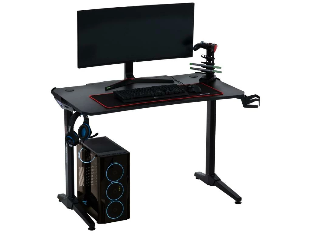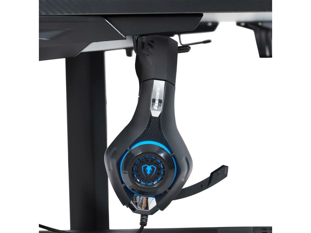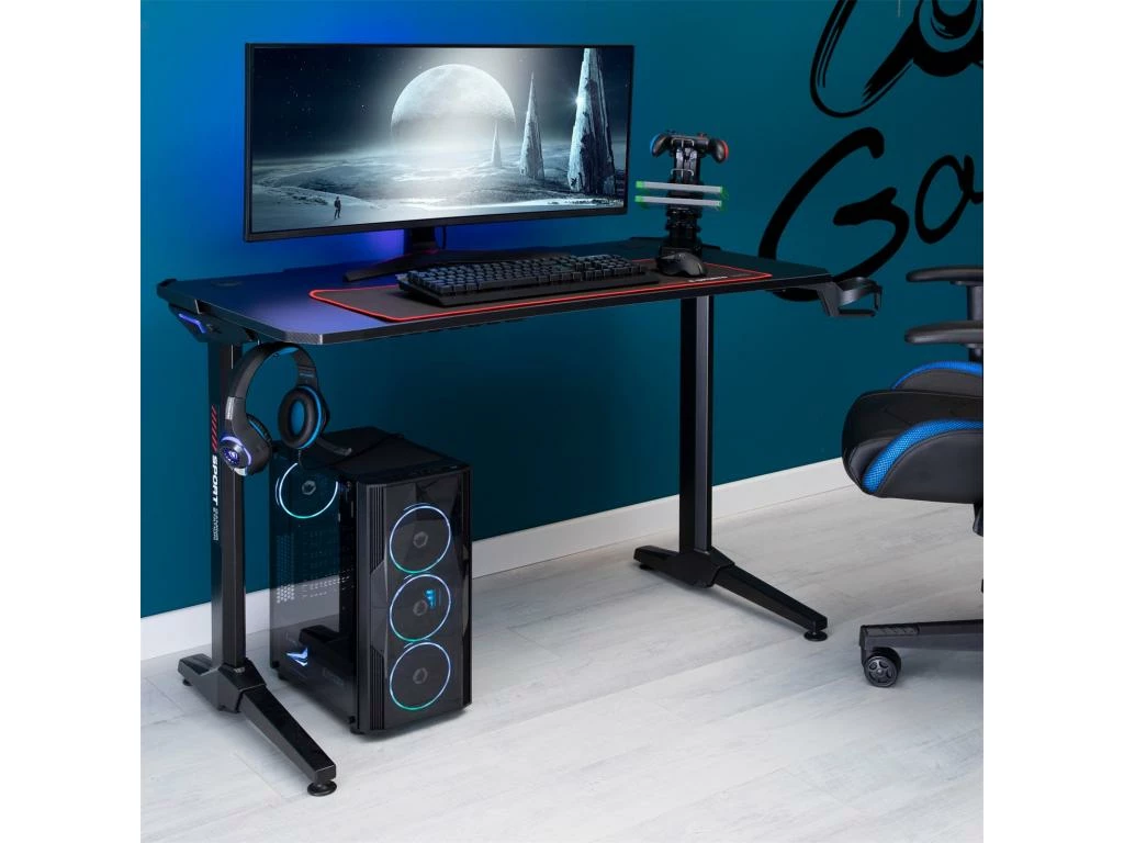 … rendra vos parties de jeu plus agréables grâce à ses multiples accessoires spécialement conçus pour le confort du joueur. Ainsi ce bureau gaming est équipé d’un porte-casque et d’un porte-bouteille afin de garder une boisson à portée de main tout au long de votre partie. Un porte-manettes est également inclus avec 4 ports USB afin de les recharger entre vos parties. Le design tendance, grâce au revêtement noir aspect carbone et aux LED bleues de 2 nuances présentes sur les cotés, plaira à tous les gamers !