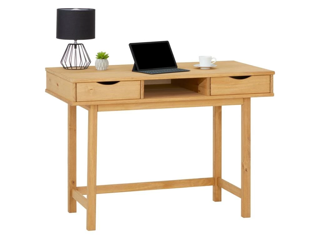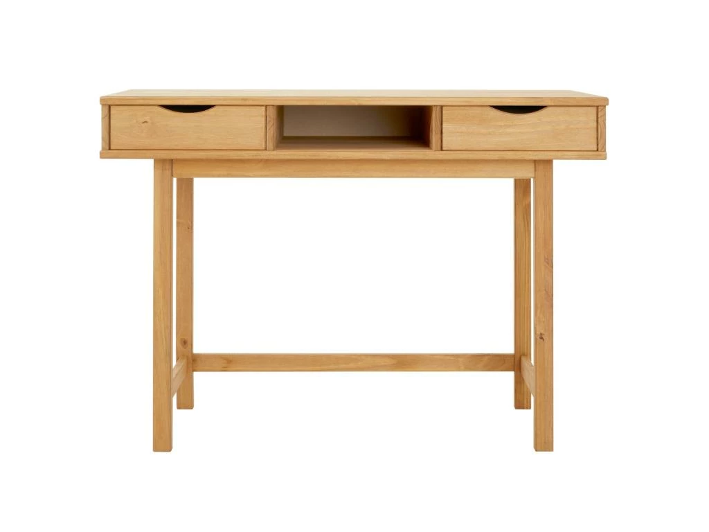 – Le bureau est fabriqué en pin massif à la finition teintée et cirée.