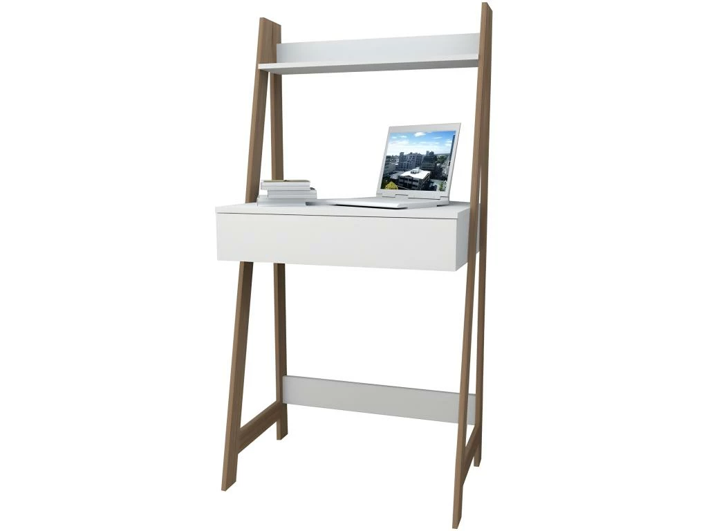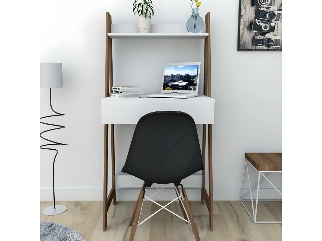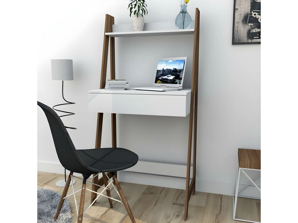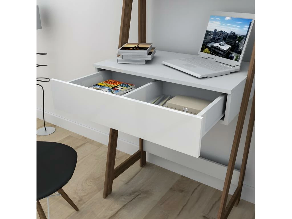 Bureau Secrétaire Contemporain. Coloris Blanc + Pieds Imitation Châtaignier.