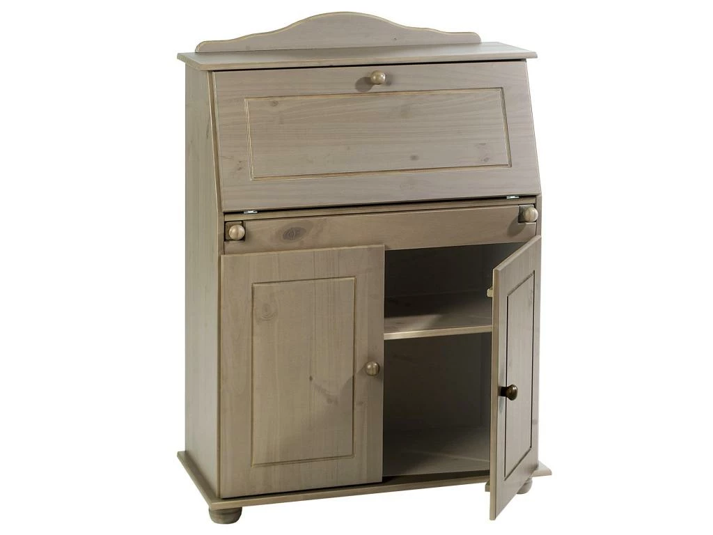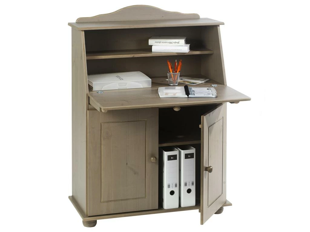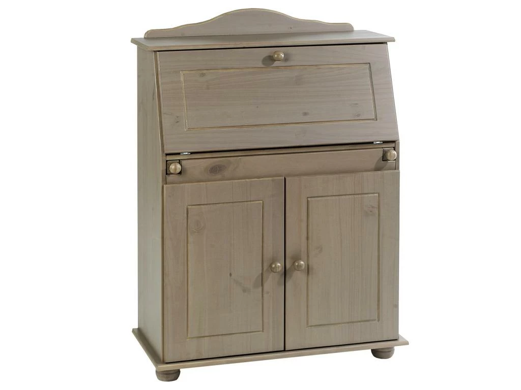 – Le secrétaire est fabriqué en pin massif, recouvert d’une lasure de couleur taupe.