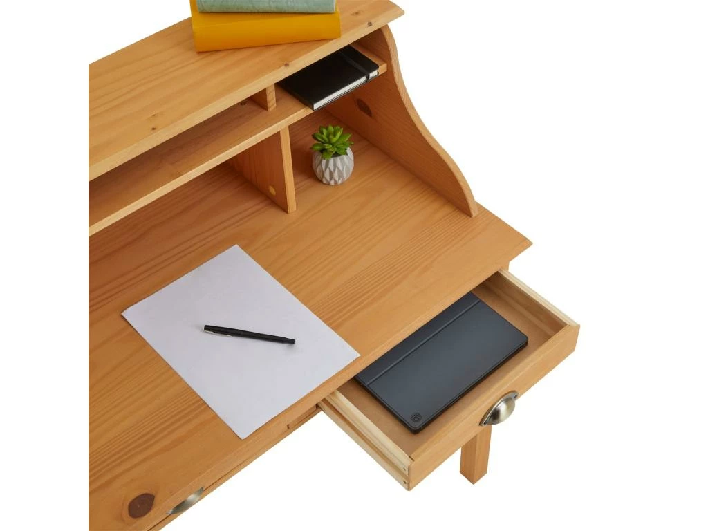 – Le bureau est fabriqué en pin massif à la finition cirée.