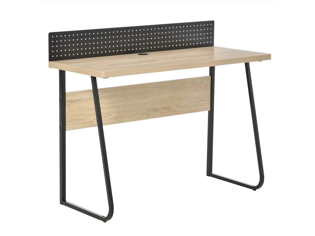 – Bureau secrétaire design industriel mélant avec élégance le métal (piètement, plaque support arrière) et le bois (plateau, support piètement en panneaux de particules)