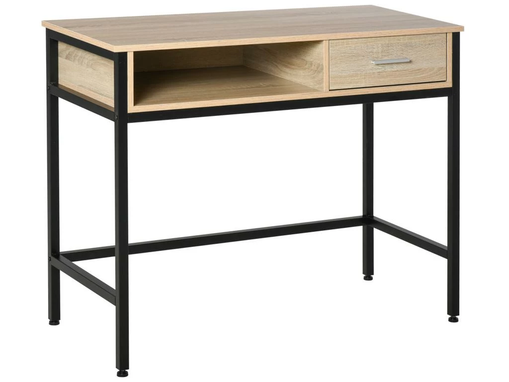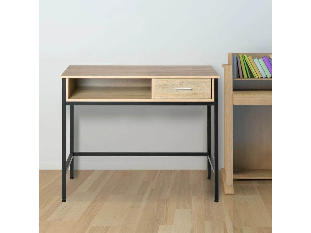 – Bureau design industriel mélant avec élégance le métal (châssis et pieds) et le bois (plateau, rebords, tiroir en panneaux de particules classe E1)