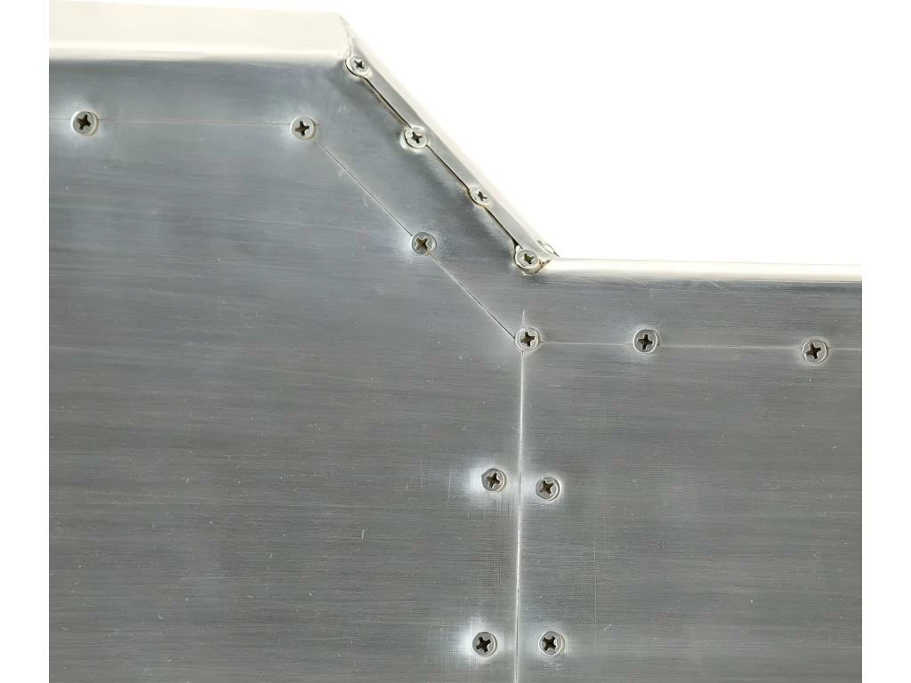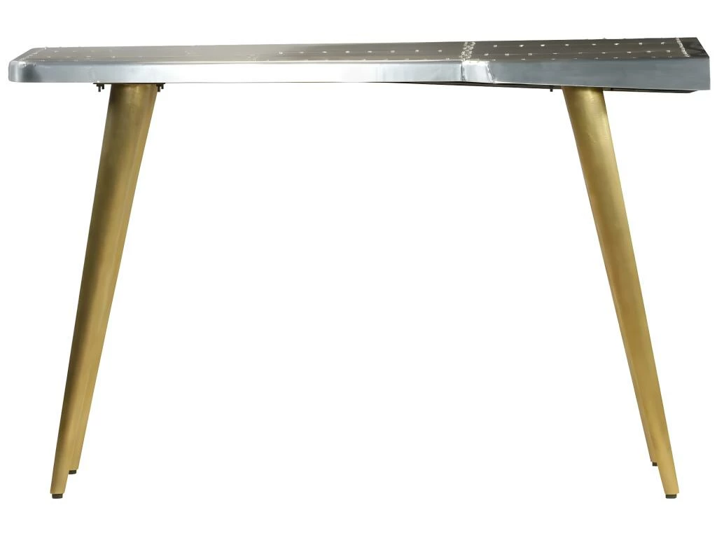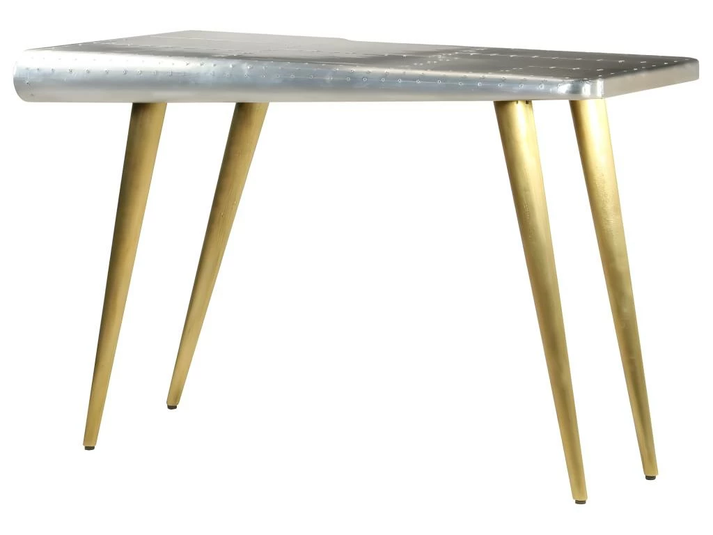 Le bureau de style aéronautique est en bois massif de manguier et sa surface est revêtue d’un patchwork de panneaux en aluminium poli, accentué par les vis en acier apparentes, ce qui le rend extrêmement résistant.