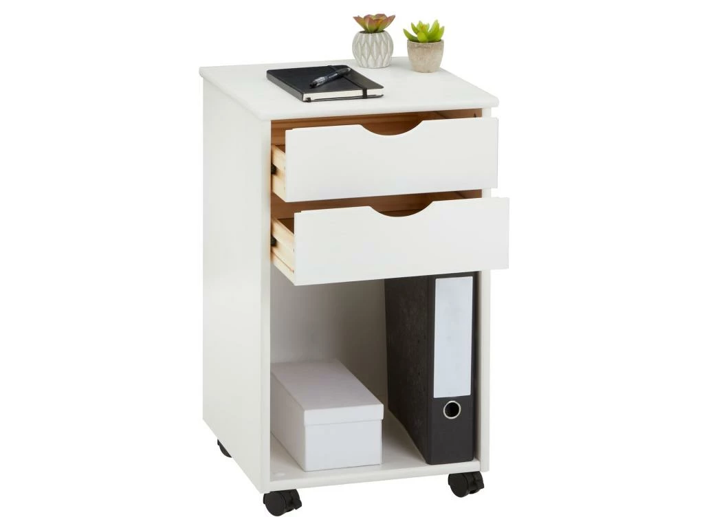 … sera parfait pour organiser et ranger votre coin bureau. Equipé de 2 tiroirs, vous pourrez facilement y placer toutes vos affaires et fournitures et vos classeur ou autres documents pourront être stockés dans la niche. Grâce à ses 4 roulettes, ce meuble de rangement pourra être déplacé selon vos besoins dans votres espace de travail. Avec sa structure en pin massif au design sobre et moderne, il se mariera aisément avec le reste de votre mobilier.