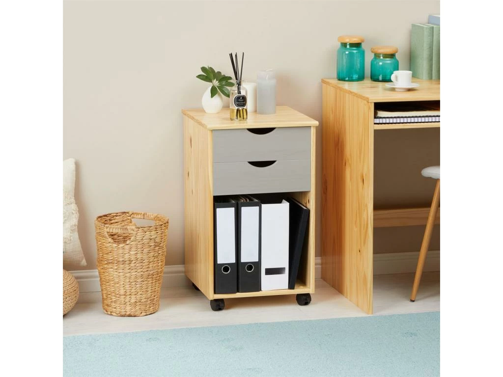 … sera parfait pour organiser et ranger votre coin bureau. Equipé de 2 tiroirs, vous pourrez facilement y placer toutes vos affaires et fournitures et vos classeur ou autres documents pourront être stockés dans la niche. Grâce à ses 4 roulettes, ce meuble de rangement pourra être déplacé selon vos besoins dans votres espace de travail. Avec sa structure en pin massif au design sobre et moderne, il se mariera aisément avec le reste de votre mobilier.