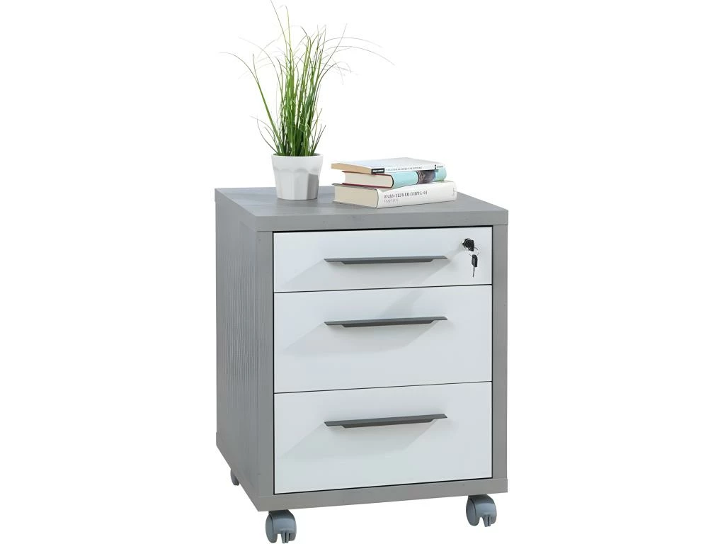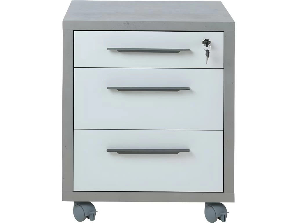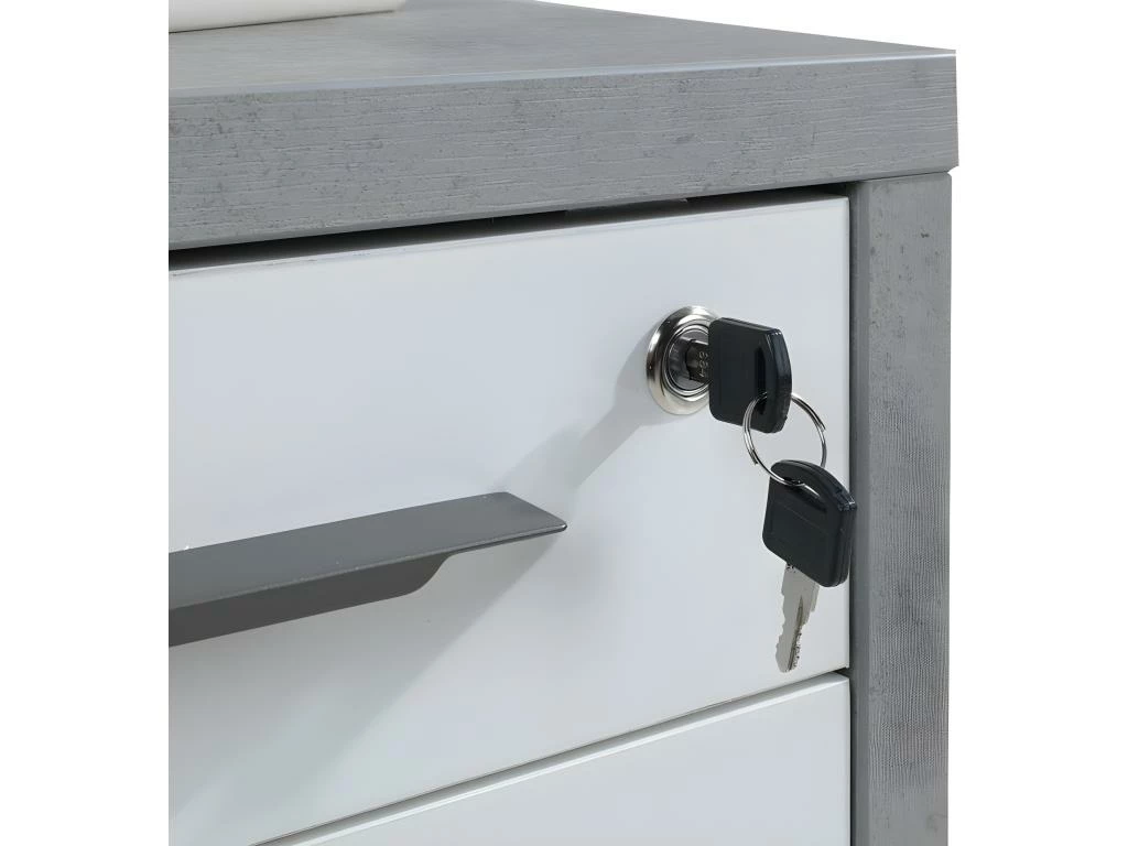 Un caisson de rangement à roulettes idéal pour optimiser vos rangements. Pratique, il se glisse sous le plateau de votre bureau. Constitué de 3 tiroirs dont le supérieur possède une fermeture sécurisée avec une serrure, il s’harmonise parfaitement avec le bureau de la collection NET. Son décor béton apporte modernité et sera idéal dans une décoration “Urban”. On aime ses poignées grises et le blanc laqué de ses tiroirs. Découvrez le mobilier de bureau NET, des meubles au design simple qui s’adaptent à vos besoins et vous facilitent le quotidien.
