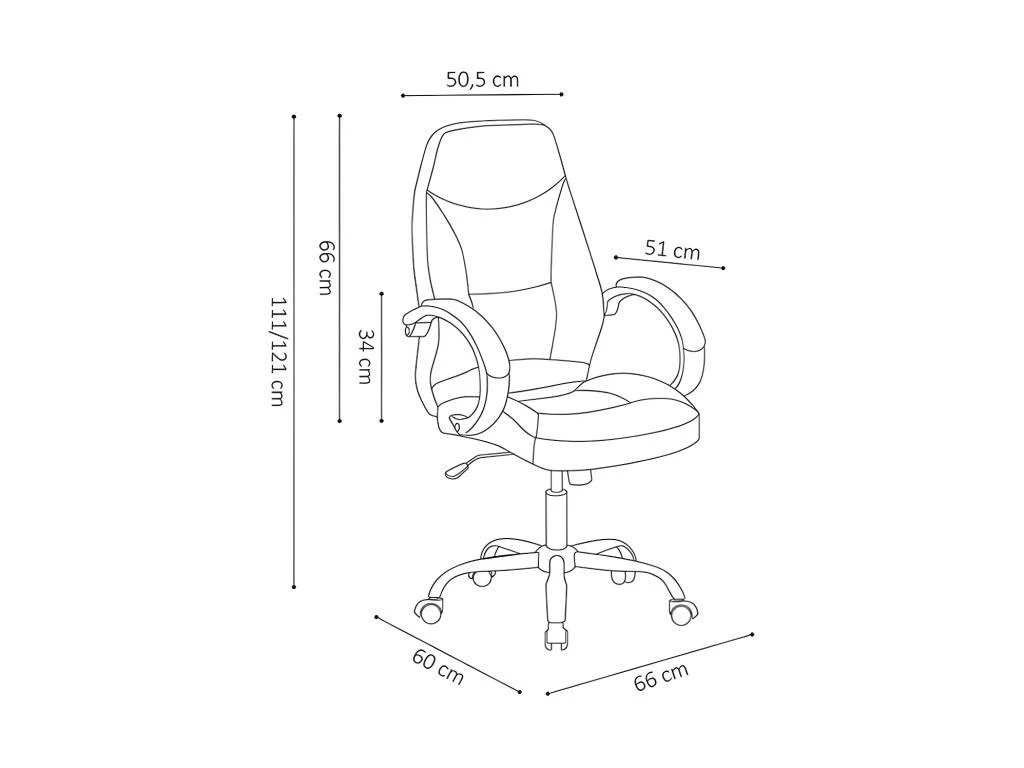 Les dimensions de cette chaise de bureau sont de H111/121 x L60 x P66 cm, ce qui la rend compacte et facile à intégrer dans n’importe quel espace de travail.