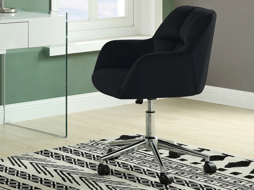 Véritable fauteuil de bureau grâce à ses accoudoirs rembourés, la chaise de bureau PEGA est entièrement recouverte de velours ce qui lui apporte un côté chic et glamour. Enfin, son piétement en métal chromé garantit sa stabilité et sa solidité.