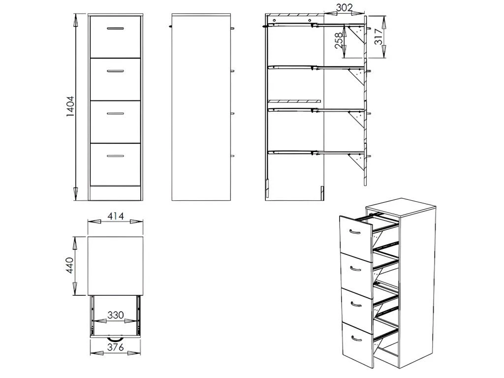 – Attention : les tiroirs n’ont pas de fond, ils ne peuvent que recevoir des dossiers suspendus (25 par tiroir).