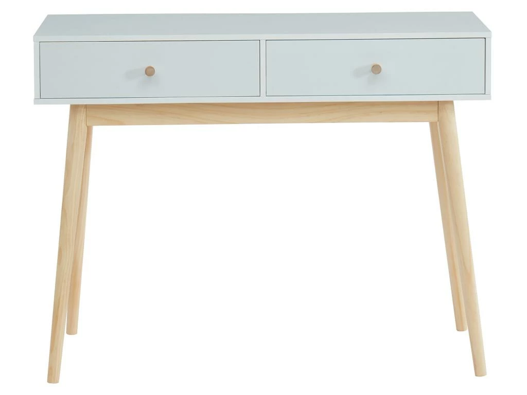 Console PETRA 2 tiroirs – Structure en MDF finition laqué blanc satiné – Pieds en pin massif – Dimensions 100x35x76cm