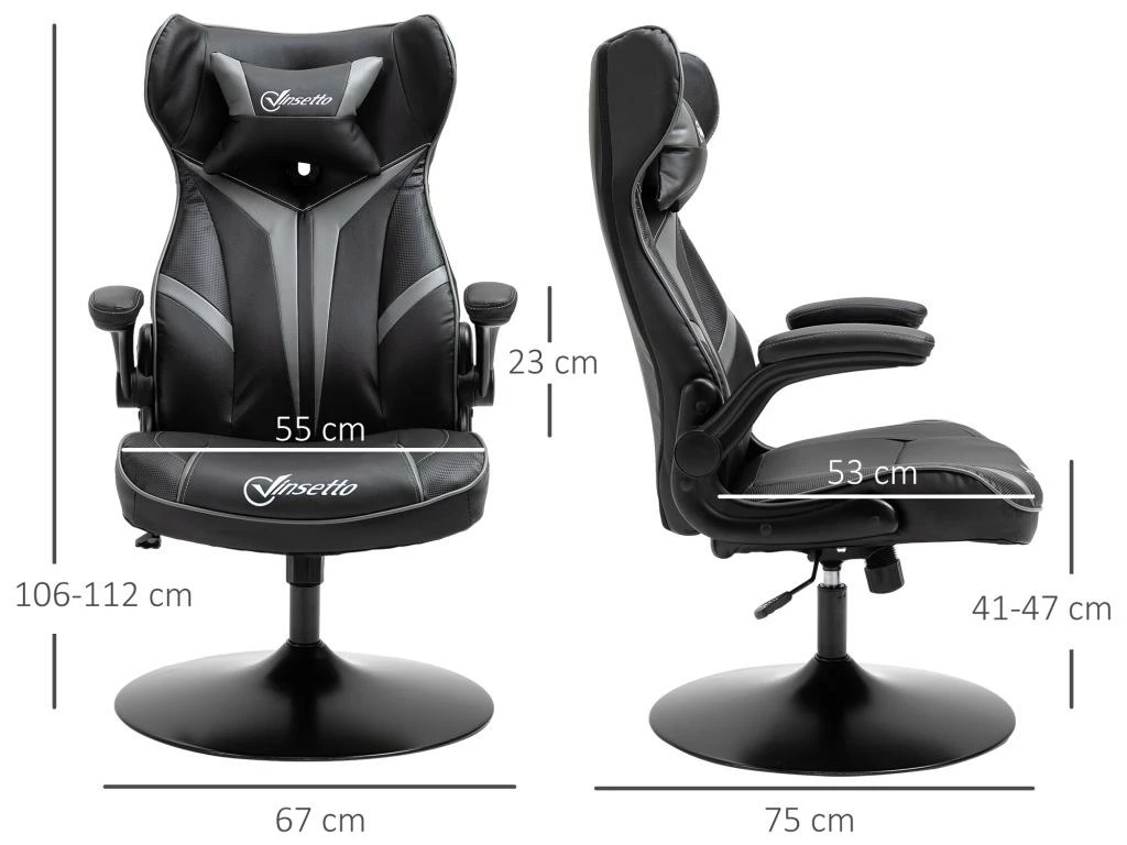 Fauteuil Gaming Base Ronde Métal Pivotante 360° Hauteur Réglable Tétière Accoudoirs Relevables PVC Gris Noir