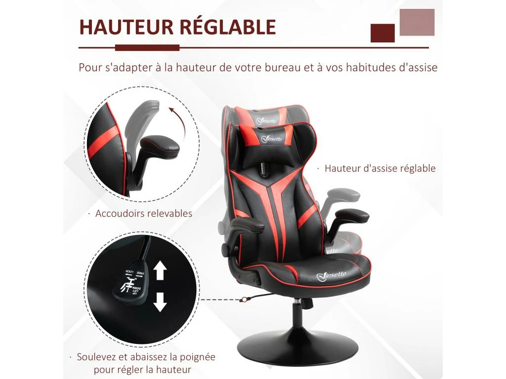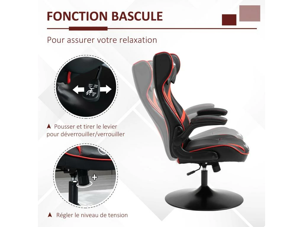 Fauteuil Gaming Base Ronde Métal Pivotante 360° Hauteur Réglable Tétière Accoudoirs Relevables PVC Rouge Noir