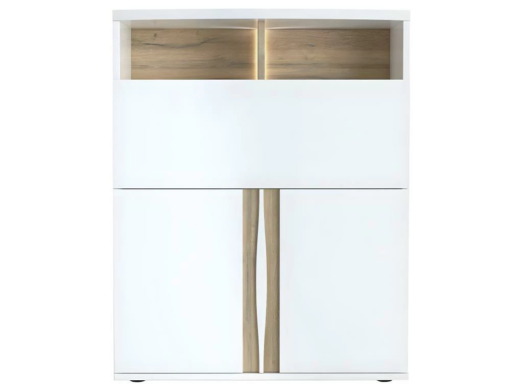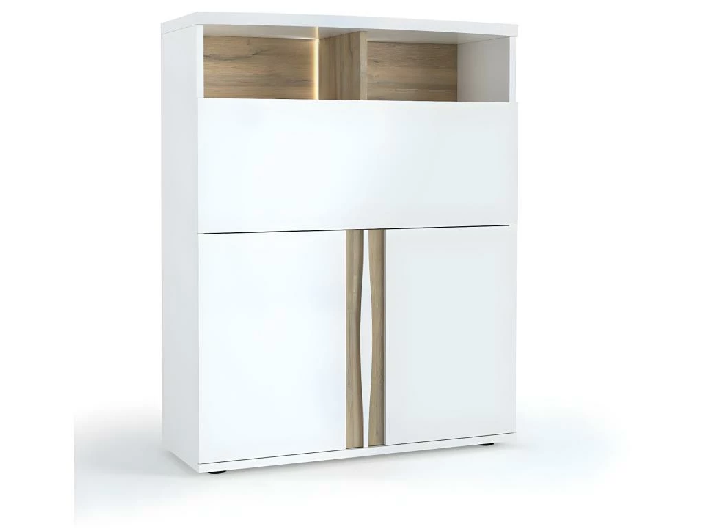 Secrétaire structure en panneaux de particules épais PEFC qui lui assure une bonne solidité, finition laque blanche haute brillance associée au chêne doré texturé et son dessus courbé en 38 mm, ornementé de sa poignée sculptée au design exclusif, aspire à un design modern-basic. Avec ses 2 portes inférieures sur charnière métallique à frein, une niche fermée sur abatant avec compas fonction bureau adapté au télétravail et deux niches supérieures de rangement ouvertes rétroéclairées par un LED diffusant, il offre un volume de rangement considérable (dossiers, imprimante, pc…). Fabrication française, quincaillerie européenne qui font de ce buffet haut un produit de qualité.